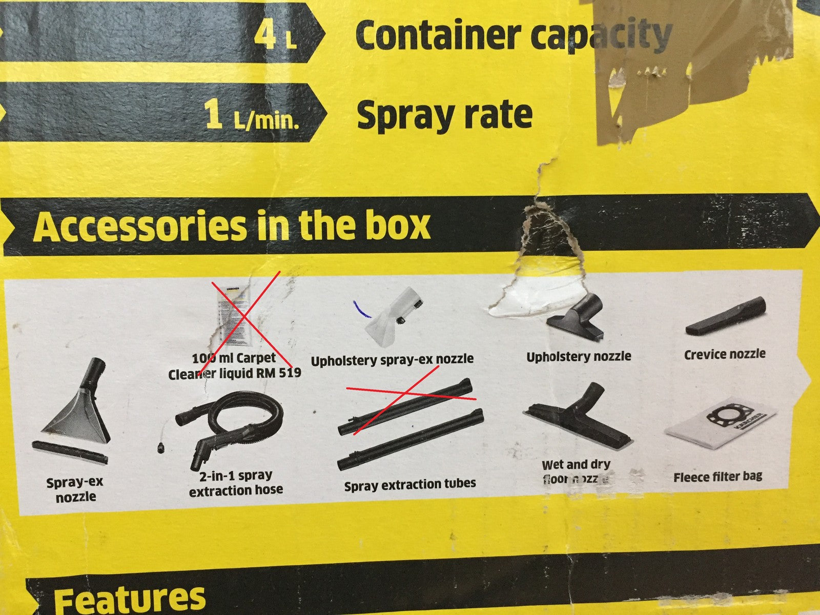 Es fehlen 1x Saugrohr und Reinigungsmittel (siehe Bild)!! Faltenfilter fehlt!! Ohne Waschdüsewassersprüher!! Gehäuse hat Riß (siehe Bild)!!